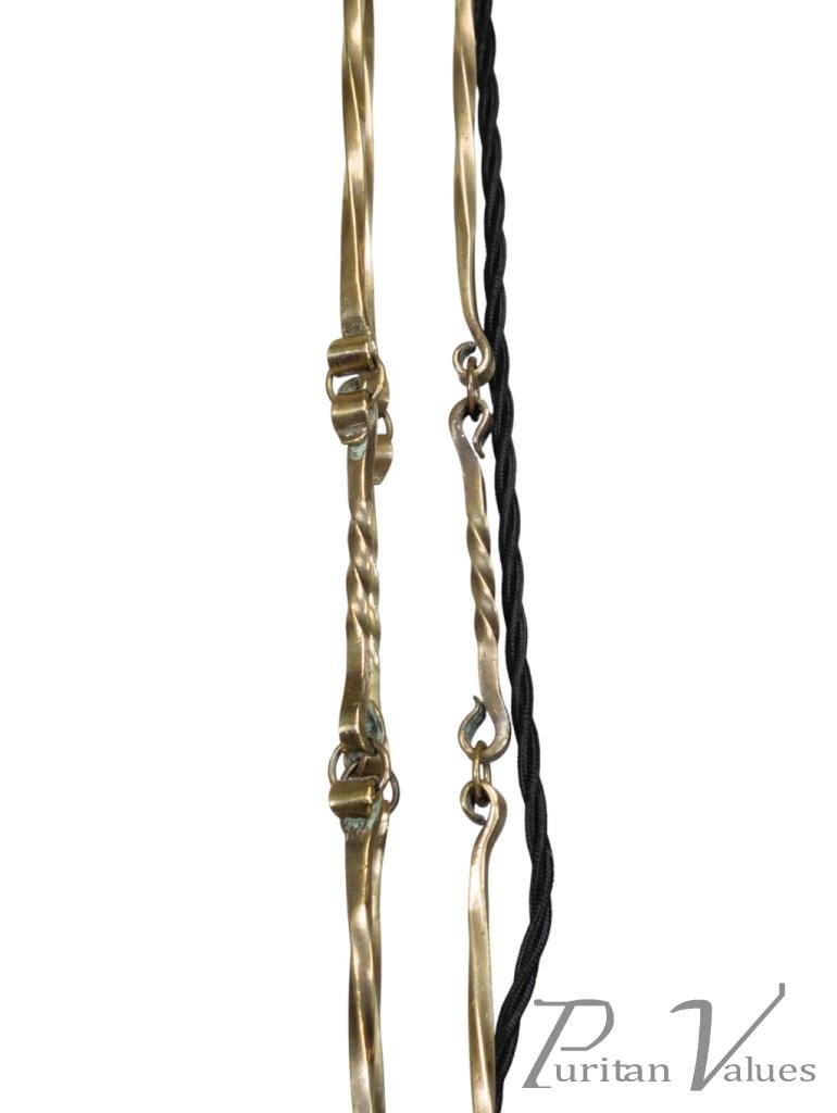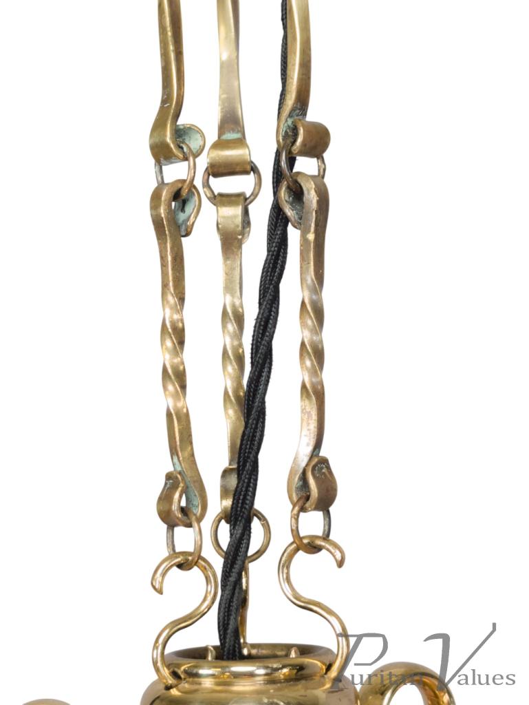 The five whiplash arms then curve up with circular scroll work details to the ends that the cables hang from, with the original scroll work shade hangers the Vaseline shades hang from.