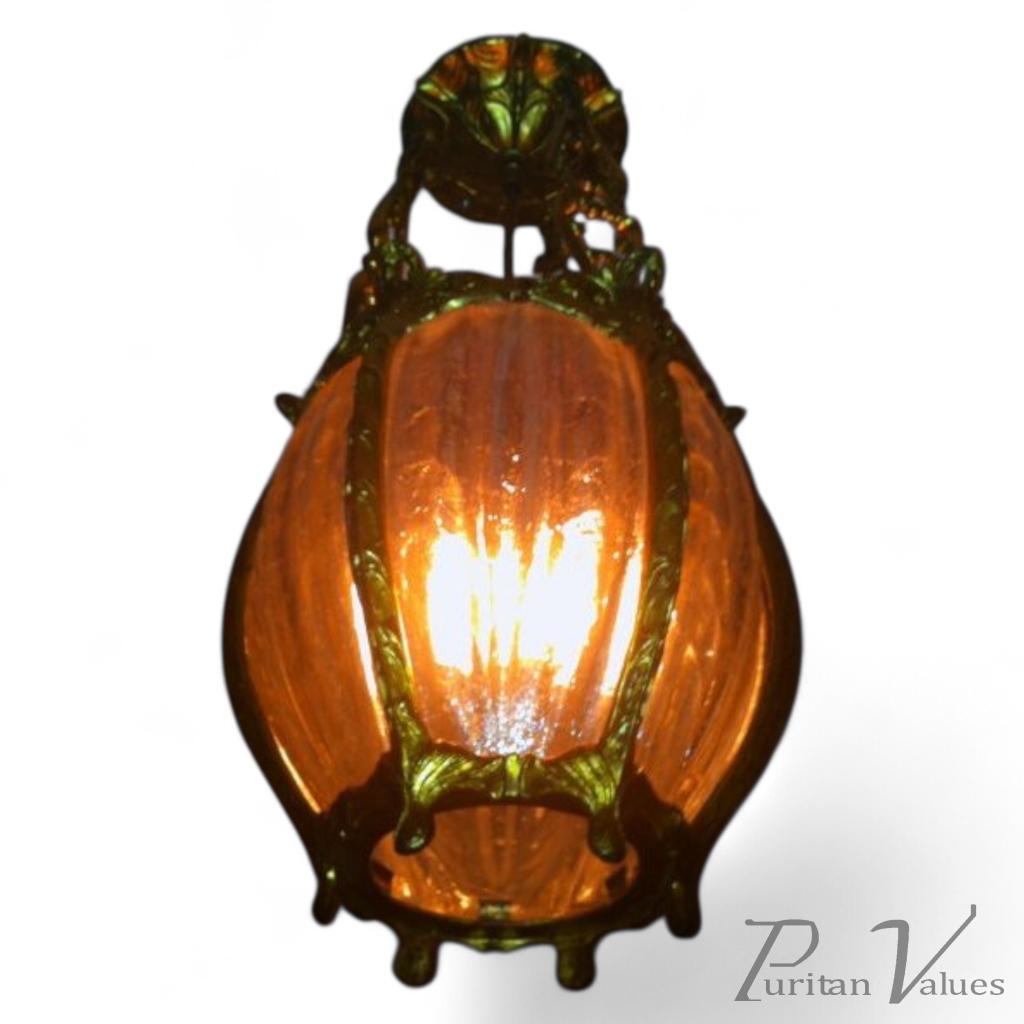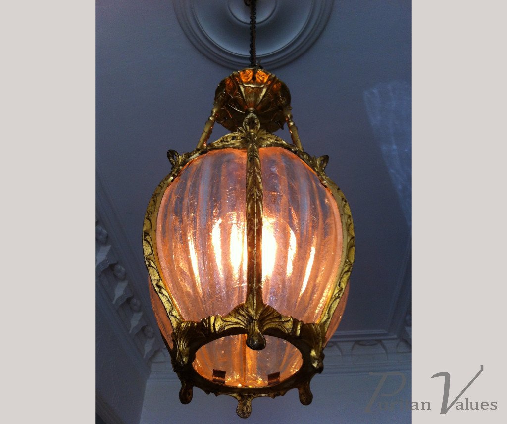 William Arthur Smith Benson (1854-1924). An exceptional pair of three light, gilt bronze ceiling lights, with heavy moulded glass.