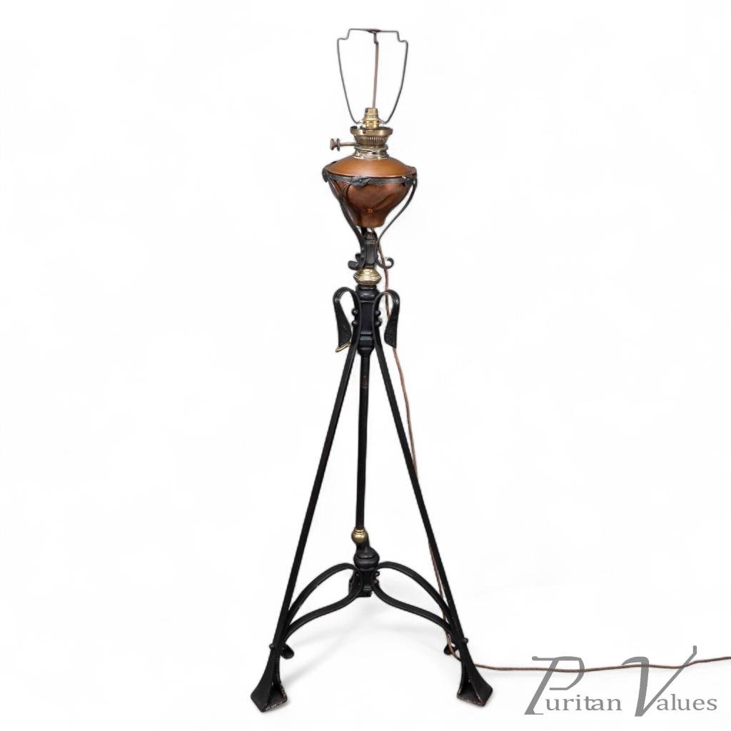 Benson’s lighting is most often realised in copper and brass; iron standards are markedly less common in his output, although recorded in auction and in catalogues that show the breadth of his metalwork. The present lamp retains period burner hardware and later electrical conversion.