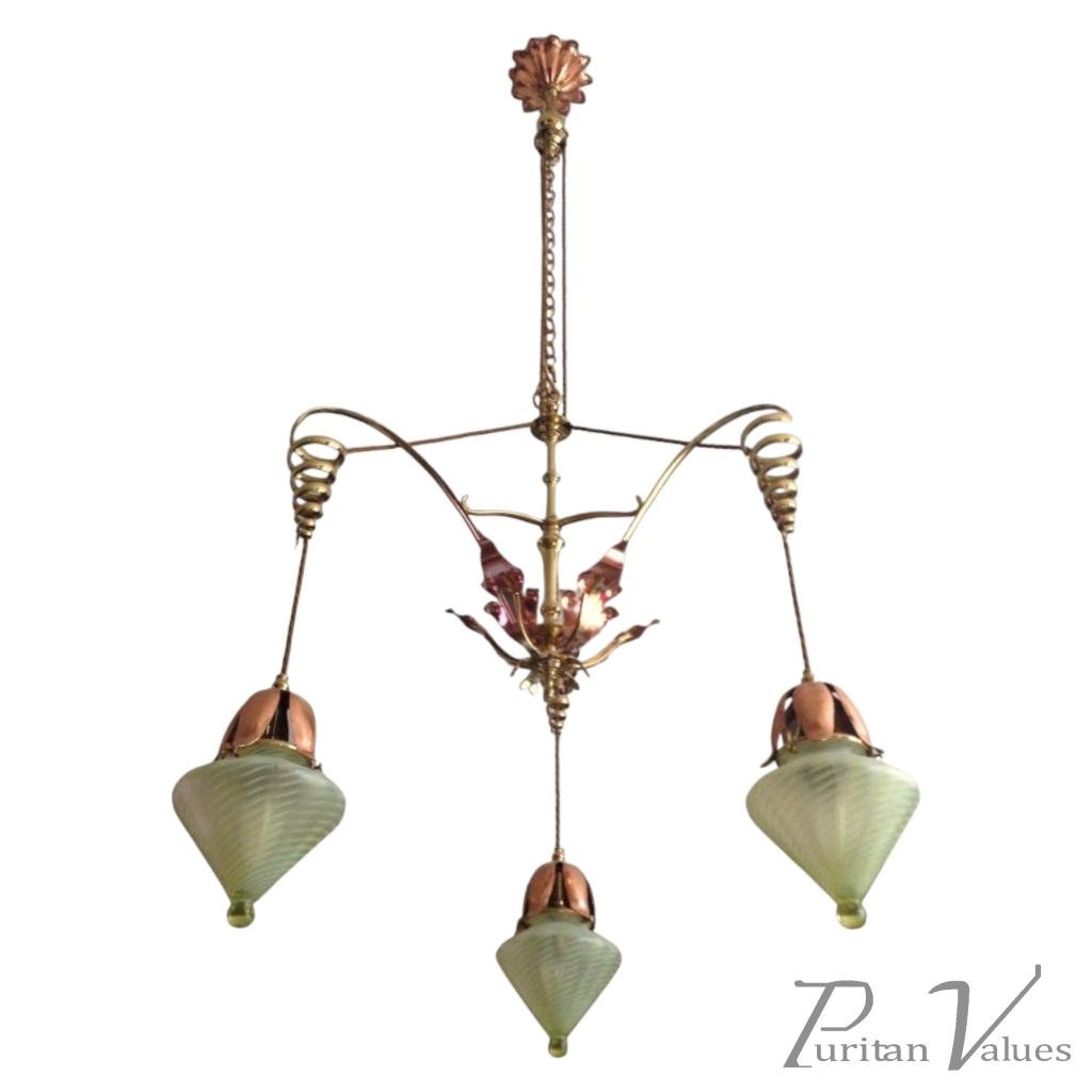 WAS Benson. An impressive copper and brass chandelier retaining the original James Powell of Whitefriars Vaseline glass shades