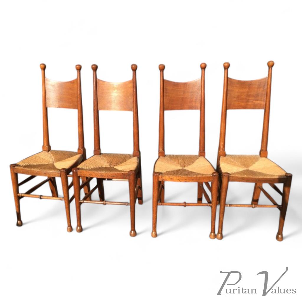 William Birch. Two sets of four oak rush seat dining chairs.