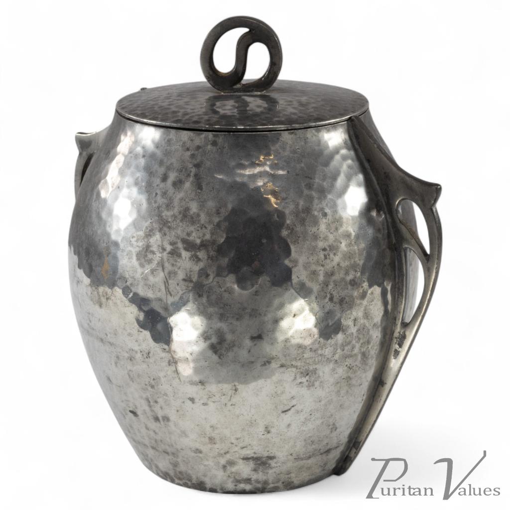 William Hutton and Sons, made for Liberty and Co. An Arts and Crafts hand hammered pewter biscuit barrel
