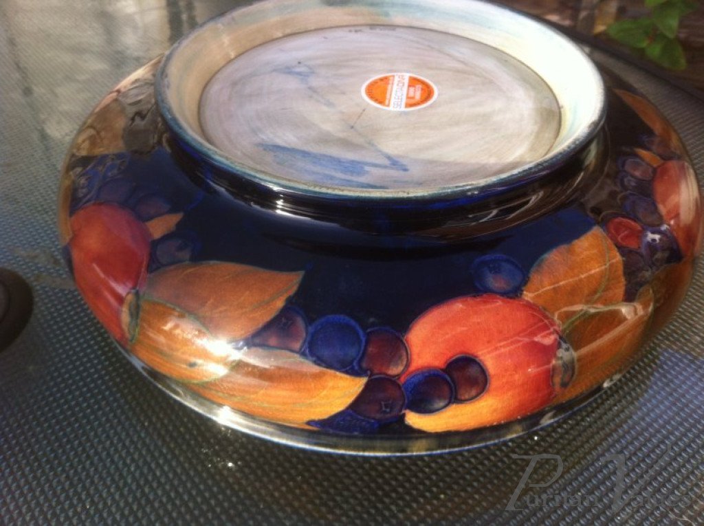 A large William Moorcroft pomegranate fruit bowl in wonderful original condition with no wear or scratches to the inside and no restorations chips or cracks. This is an exceptional piece, I have not seen another of this size or shape on the net. Height 3 1/4", Width 11 1/2" across the top. Circa 1910.