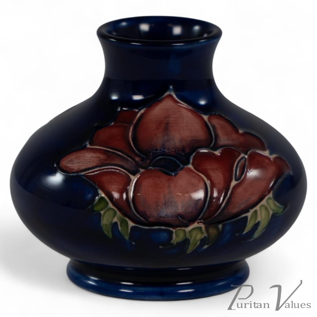 A small blue-glazed vase designed by William Moorcroft (1872–1945) and produced at the Moorcroft Pottery, England, in the early 1920s. The bulbous form is decorated in the Anemone pattern, with slip-trailed and tubelined flowers hand-painted beneath a deep cobalt glaze. Signed H. M. Made in England to the base, denoting the period when Moorcroft’s designs were sold through Liberty & Co. The vase exemplifies his mastery of rich tonal glazes and his influence on early 20th-century British studio ceramics.