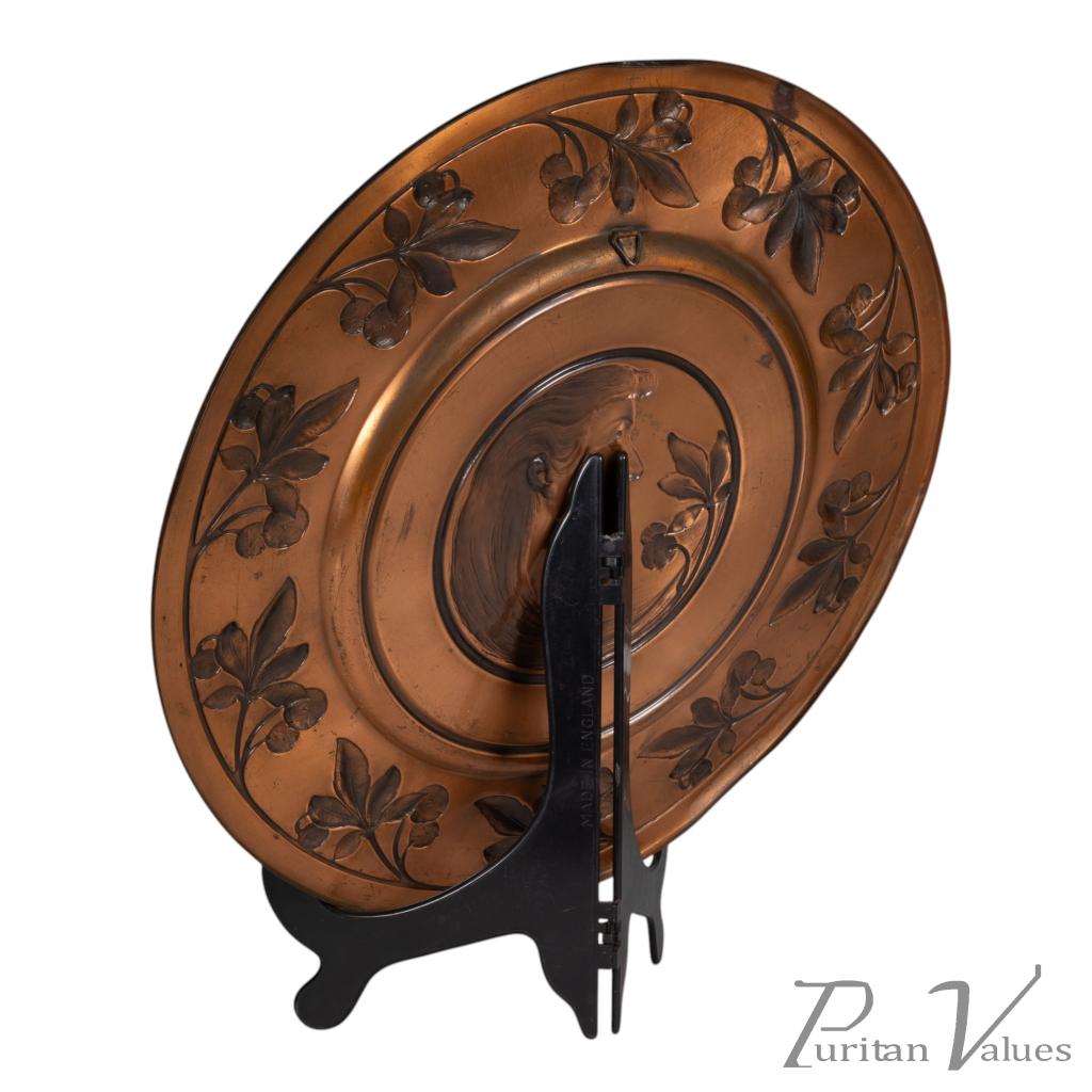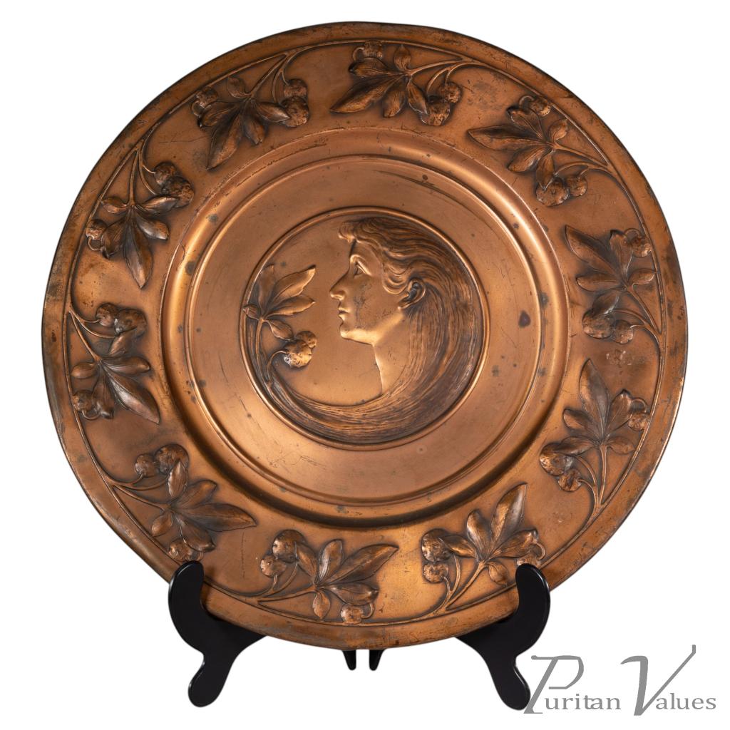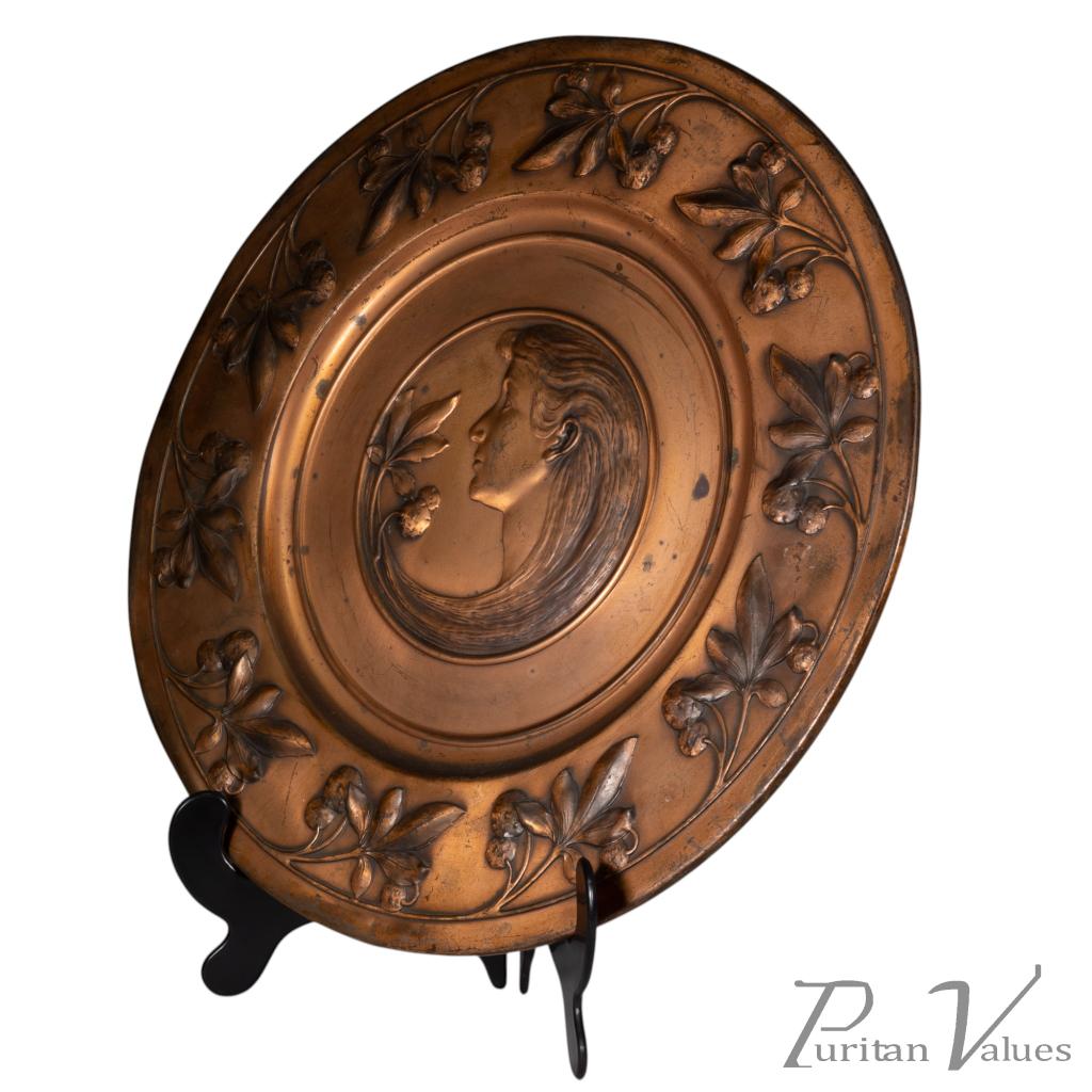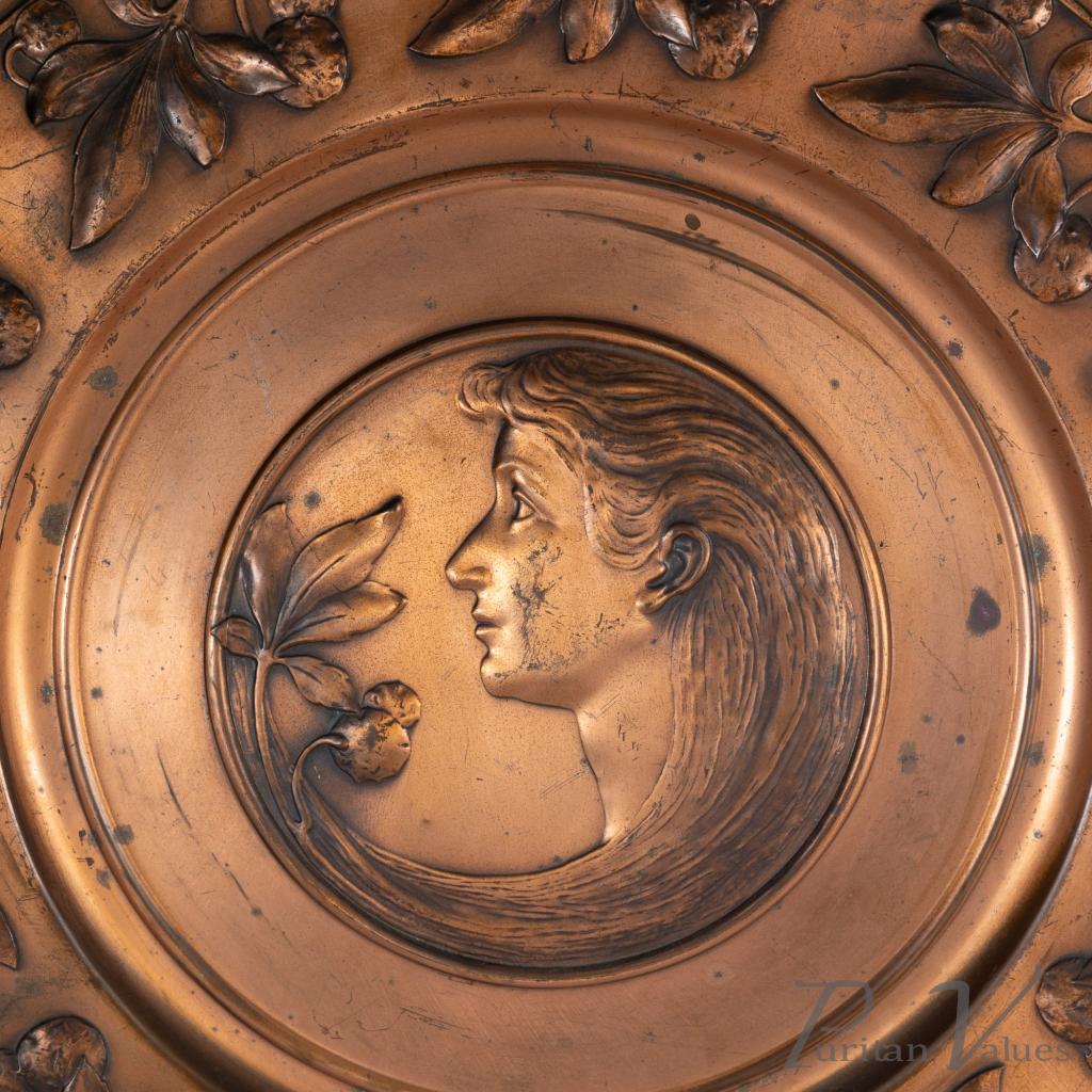 Pair of wall plaques in brass, of the Art Nouveau period (1890–1910). Made by WMF (established 1853–present), each circular plaque carries a central portrait, one depicting a lady and the other a gentleman, enclosed within a running border of fruiting strawberry vines. The decoration unites natural motifs with fine repoussé work, a hallmark of WMF’s early twentieth-century production.