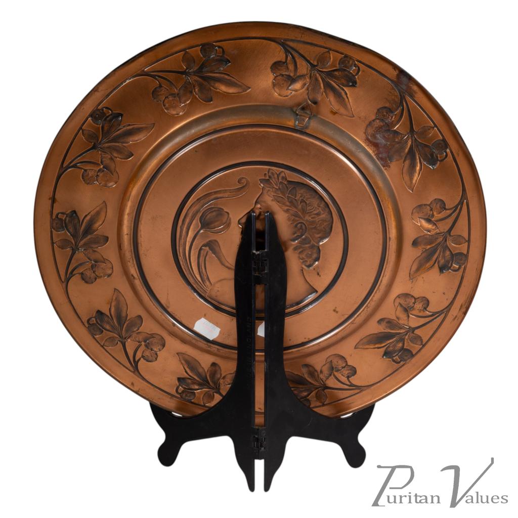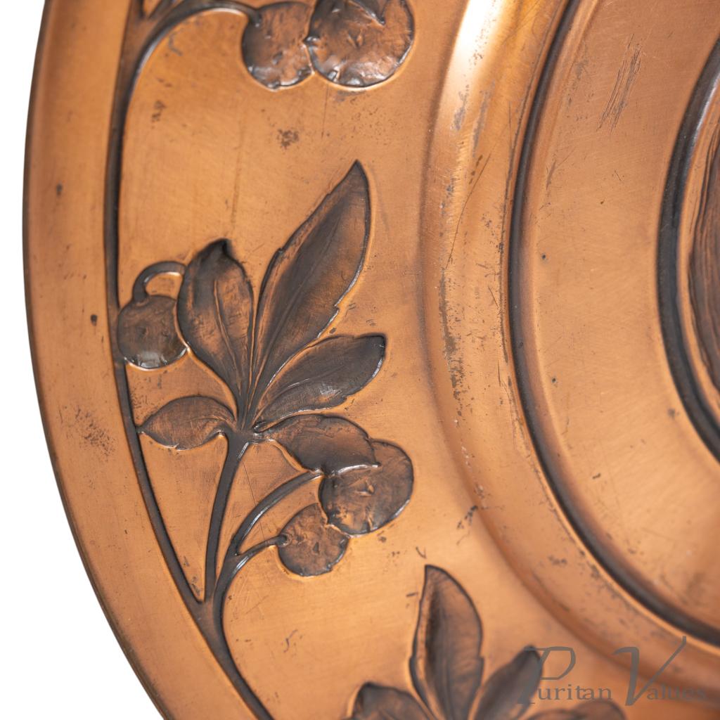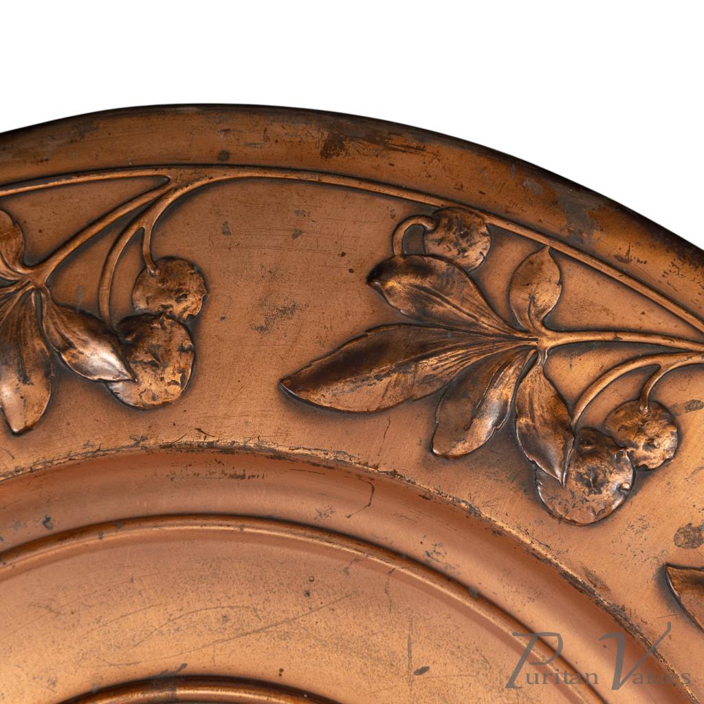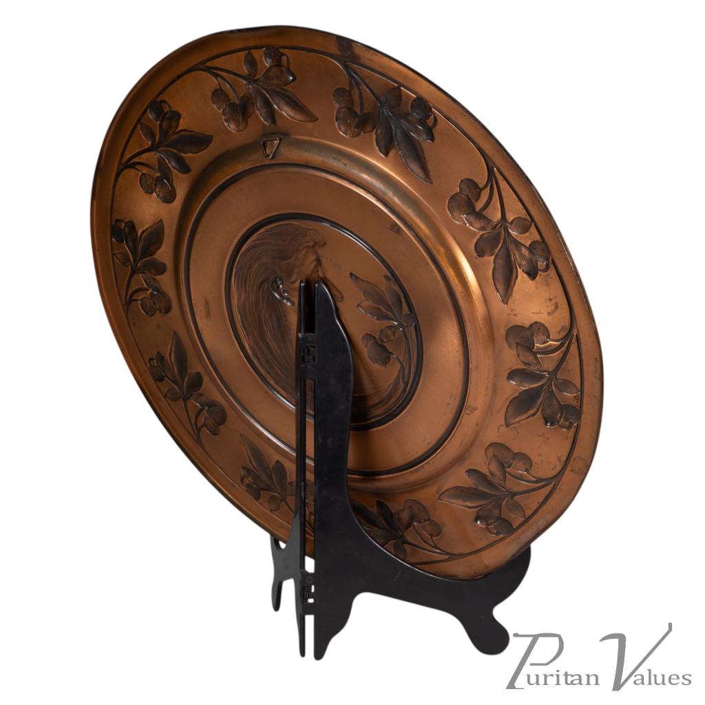 Pair of wall plaques in brass, of the Art Nouveau period (1890–1910). Made by WMF (established 1853–present), each circular plaque carries a central portrait, one depicting a lady and the other a gentleman, enclosed within a running border of fruiting strawberry vines. The decoration unites natural motifs with fine repoussé work, a hallmark of WMF’s early twentieth-century production.