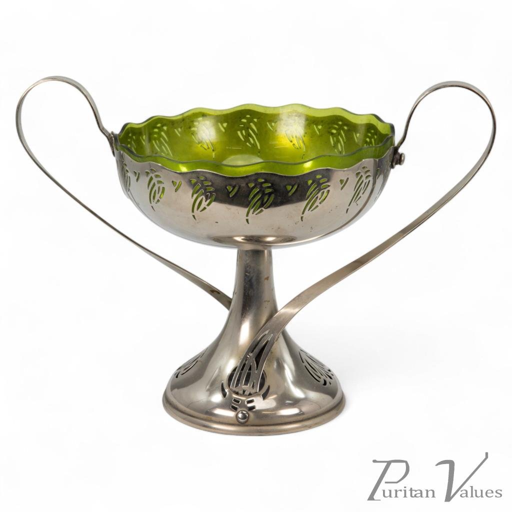 Produced by WMF (Württembergische Metallwarenfabrik) around 1900, this Art Nouveau silver-plated centerpiece combines organic form with functional design. The bowl is set with its original green glass liner, the scalloped rim and pressed foliate motifs contrasting with the engraved decoration of the silver plate. The flared base rises into a pair of sweeping whiplash handles, a hallmark of Jugendstil metalwork.