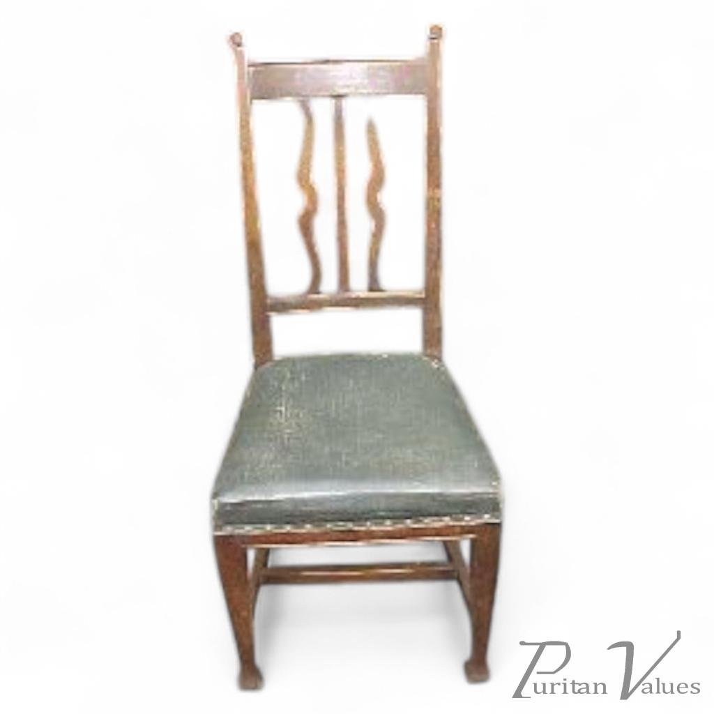 A good quality Set of five (one carver) Arts and Crafts oak dining chairs by Wylie and Lochhead, they have all been cleaned and waxed now and ready for upholstery. A picture of this chair is illustrated in the Wylie and Lochhead catalogue of 1901.